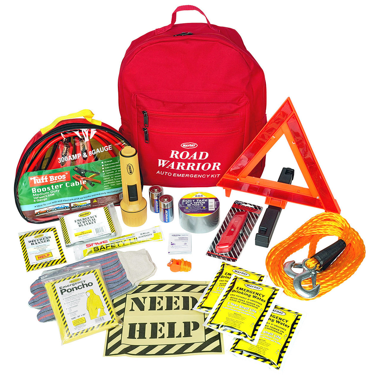 This kit fits most all road emergency situations. All items are packed in a heavy-duty backpack. Kit contains:
